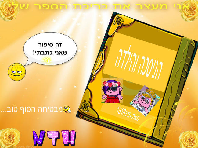 שלום לכולם! אני החלטתי להישתתף בבלוג הפרס אני עצבתי וחשבתי המון זמן איך תראה הכריכה של הספר שלי אני יכולה להגיד שהספר שלי מלא מוסר השכל,מתך,ודרמה. מי שרוצה שאכתוב את הסיפור בפעם הבאה שירשום בתגובות למטה אשמח ליזכות תודה לכל מי שמגיב![מי שרוצה הקדשה של יצירה בפעם הבאה שיכתוב כל הקודם זוכה] |