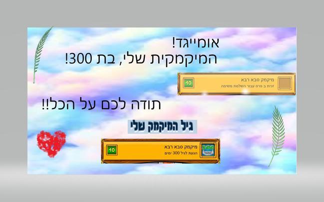היוש בלונים!!! אתם לא מבינים! נכנסתי למיקמק היום, ופתאום אני רואה שקיבלתי פרס על זה שאני בת 300!!! אני מהזה מתרגשתתתת [נכנסתי היום אבל הייתי בת 300 אתמול] אז אני רוצה לומר תודה לאנשים הבאים: