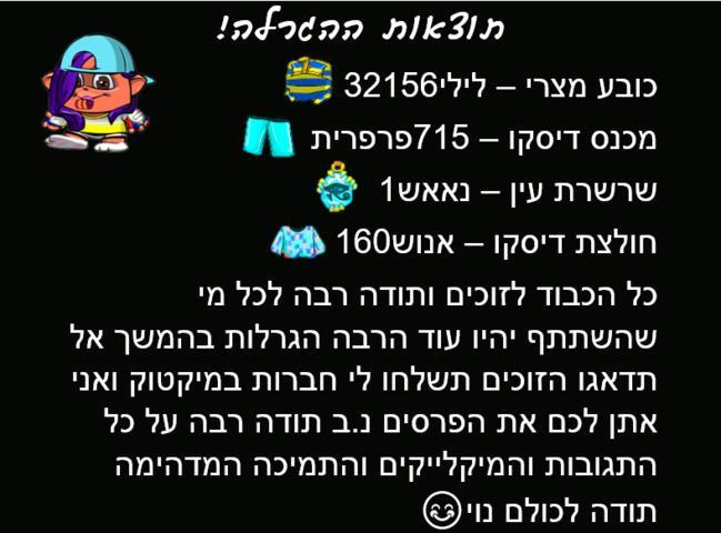היי לכולם אז כפי שאתם רואים יש כאן את תוצאות ההגרלה של ההגרלה!!!!! מזל טוב לזוכים ומי שלא זכה יהיו עוד הגרלות ורציתי לומר תודה על התמיכה בזמן האחרון תודה רבה לכל מי שתומך זה משמח מאוד וזהו חח תודה לכולם נוי:)
