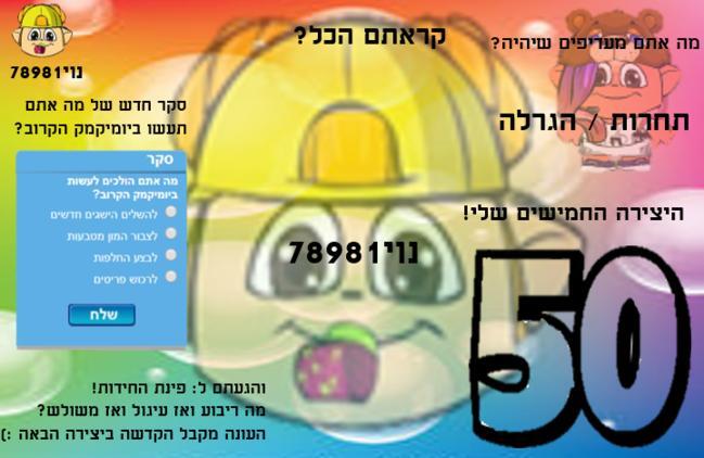 היי לכולם אז עשיתי יצירה של חמישים יצירות בקהילה זה זה המון ולא הייתי עושה את זה בלעדיכם לא יודעת אם שמתם לב אבל לא הקדשתי את כל היצירה לחמישים יצירות אלה זה מגוון אז מקווה שאהבתם נ.ב בחלק מהיצירה לא יודעת אם ראיתם יש תחרות / הגרלה מה שאתם צריכים לעשות זה להגיד לי מה אתם מעדיפים שאני יעשה לכבוד החמישים יצירות והנה השאלות שהייתי רוצה שתענו לי עליהם: 1. אהבתם את היצירה? 2. מה התשובה לחידה שבפינה למטה? 3. מה אתם מעדיפים תחרות או הגרלה?