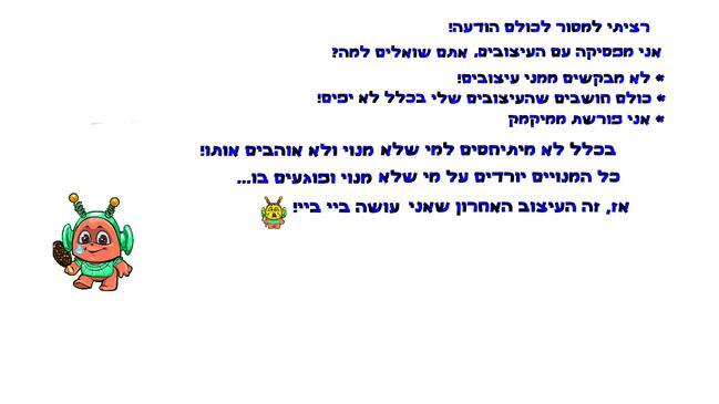 אני מנוי ואני לא מעליב אף אחד אלא מעודד אותו ורק שתידעי את לא חייבת להיעלב ממנויים רשעים פשוט אל תתיחסי שלך רועי טסלר |