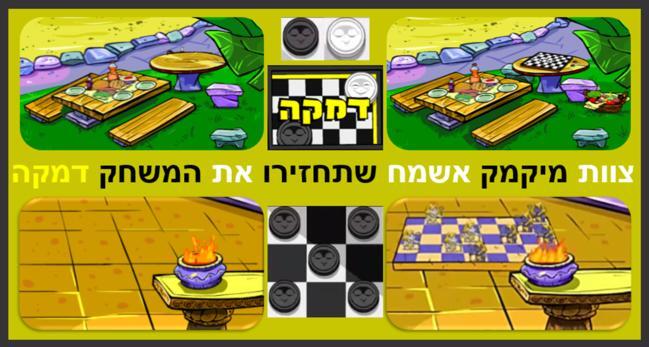 שלום, ראיתי לאחרונה שאין את המשחק דמקה בפארק הוותיק, ובקומה השנייה שבמקדש שבג'ונגל, אני אוהב את מטרת המשחק: להוריד מהלוח/לאכול את כול החיילים של היריב, או לחסום אותן: לא לתת ליריב להתקדם (צעד/מהלך). אני אוהב גם את הדרישה של המשחק: תחכום, שימוש רב בטקטיקה וידע תאורטי רב, אשמח להתייחסות שלכם בנושא ואני מקווה שאהבתם את היצירה שהכנתי.