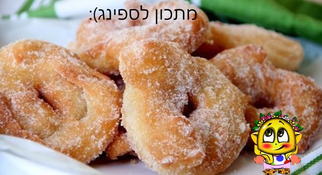 היי בנדנות❤ מה נשמע?, עוד פחות משעה אנחנו נפגשים ליום הולדת שלי, אז בנתיים החלטתי לתת לכם מתכון לספינג שהכנתי בבית, היום אז בואו נתחיל: מרכיבים: 1 ק"ג קמח 50 גרם שמרים 1/2 כוס סוכר 1/2 כפית מלח 800 מ"ל מים 1 וחצי ליטר שמן לטיגון 2 כוסות סוכר לציפוי אופן ההכנה: 1. בקערה גדולה מערבבים קמח ושמרים, מוסיפים סוכר ומלח ומערבבים לתוך הקמח. 2. מוזגים פנימה חצי מכמות המים ומתחילים ללוש את הבצק בידיים, בהדרגה מוסיפים את יתרת המים, וממשיכים ללוש דקה נוספת. אסור ללוש יותר מידי, הבצק יהיה נוזלי וזה בסדר. 3. מכסים בניילון ומחכים שהבצק יכפיל את נפחו. 4. בידיים רטובות מערבבים את הבצק התפוח להוצאת אוויר, מכסים ומתפיחים שוב להכפלת הנפח. 5. מחממים שמן בסיר נמוך ורחב, טובלים את הידיים במים או בשמן, חותכים עיגולים בגודל קלמנטינה יוצרים חור במרכז הכדור ומותחים את השוליים לצדדים, מניחים בזהירות בשמן החם. 6. מטגנים עד להזהבה משני הצדדים כ-2-3 דקות . 7. מוציאים את הספינג' לנייר סופג לספיגת עודפי השמן למשך דקה, טובלים כל ספינג' בסוכר משני הצדדים ומגישים חם. זהו. מקווה שאהבתם, ונתראה עוד מאת ביי לבנתיים❤