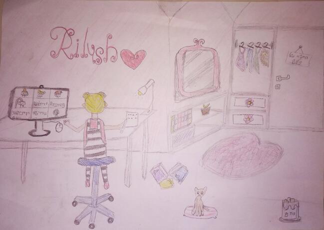 בעצם ציירתי את המיקמקית שלי, שהיא בשיחת זום עם חבריה לכיתה. עשיתי רקע של חדר שיש כמעט לכל ילד רגיל וחברתי. ציירתי הכל מסודר, אבל איך אפשר בלי קצת בלאגן? הוספתי ספריי לימוד על הריצפה זרוקים, ולידם ציירתי כרית על הריצפה שעליה נמצא הכלב שלי. (אין לי באמת כלב אני פשוט ממש רוצה;))