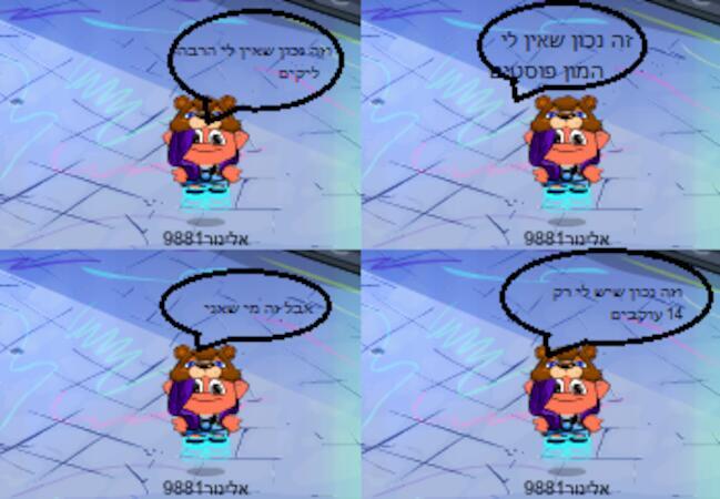 הי חברים היום אני אדבר אתכם בנושא קצת אחר... אני יודעת שאין לי מלא עוקבים ואני יודעת שאין לי מלא פוסטים ואני יודעת שאין לי מלא לייקים אבל אני יודעת מה כן יש לי אתכם כל מי שאיתי תמיד אז אני ממש אשמח אם מישהו יוכל ללחוץ על הכפטור של העוקב ולתת לי לייקים אני ממש אשמח ומי שלא זה בסדר כי אני מכירה אנשים שאפילו ליקים אין להם אז אשמח אם תפיצו את זה ביוש