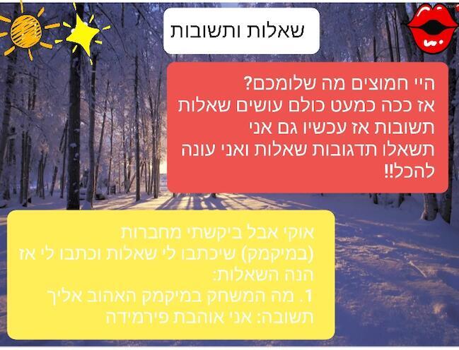 היי חמוצים אז היום הכנתי לכם שאלה אחת בשאלות ותשובות אז תשאלו שאלות ותשובות ואני יענה אליהם
