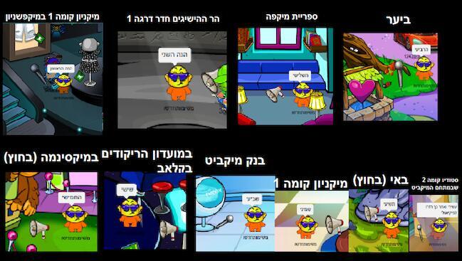 1.בחנות הבגדים מיקפשניון (קומה1) 2.בחדר דרגה 1 שבהר ההישגים 3.בספרייה של מיקפה 4.ביער (ליד הבאר) 5.במיקסינמה (בחוץ) 6.במועדון הריקודים שבקלאב 7.בבנק מיקביט 8.במיקניון (ליד הבאר משאלות של מונדו) 9.באי (בחוץ) 10.בסטודיו שבמרכז מיקביט (קומה שניה) 11.חיזרו למיקיאוולי לקבל את הפרס |