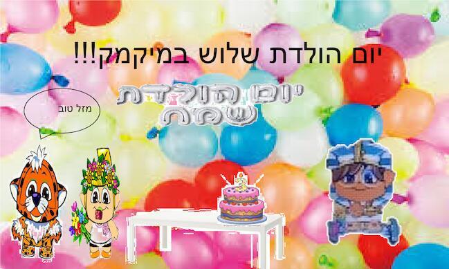 היי מיקמק איזה כיף אני חוגג שלוש שנים במיקמק היום לפני שלוש ימים אני פם888 אקרתי את מיקמק חבר שלי המליץ לי על המשחק ומאז אני מכור עליו כל החיים שלי זה מיקמק אז היום אני חוגג יום הולדת שלוש ומחר היה מסיבה גדולה לכבוד יום הולדת שלוש מתי יעלה בהמשך מקווה שתהנו ביי כל מי שיכול להמליץ על הקהיהל שלי או לשים עוקב אשמח