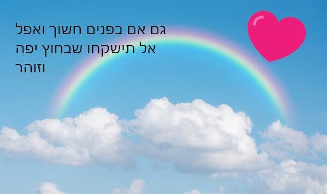 היוש אהובים שלי זה המשט הראשון שלי שאני עושה אז המישפט הוא גם אם בחוץ הכל אפל וחשוף אל תשקחו שבחוץ יפה ומואר חחח זה כיאילו נגיד בהתחלה אני עצובה בתוכי ביטלו איזה משהו ביגלל הקורונה אבל לא לישקוח את הצד החיובי לא לישקוח שיש בחוץ יופי וזוהר אז להיות בקיצקץ כל הזמן שמחים נגיד כל הזמן ששלחתי למנהלים שאלות והם לא ענו לי זה העציב אותי אבל לא היתיאשתי וניסיתי ואז ענתה לי המנהלת שקוראים לה יאנצי והיא דיברה איתי חח מקווה שקיבלתם את המספר ביוש