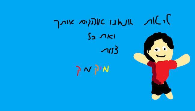 היי לכולם אני ציירתי את זה בגלל שבזמן האחרון צוות מיקמק ניסו כל הזמן לעודד אותנו בבידוד להיות בחגים במיקמק ולהגיד את האמת אני הייתי חולה ולא יכלתי ליהות בפסח אבל מיקמק עזרו לי לחבות פסח לא מהעולם הזה |