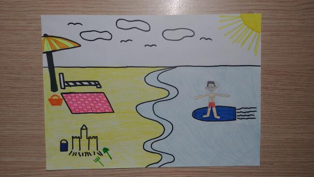 בציור שציירתי רואים את המיקמק שלי גולש בים על הגלשן הכחול שלו. ומקודם בחול הוא בנה ארמון חול. וכשהוא רוצה להשתזף הוא יכול להשכב על המחצלת שציירתי.