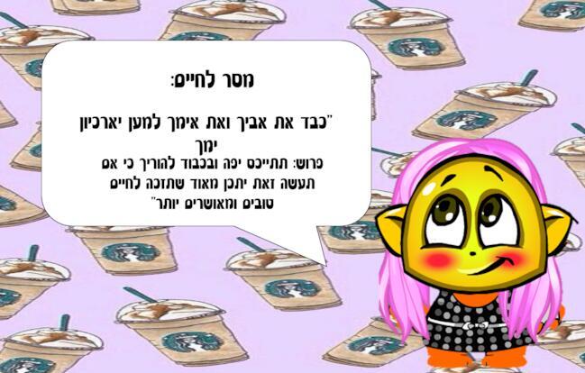 יצירה מאוד יפה! רק הערה קטנה- לא מדובר במסר יפה או אימרה חכמה- מדובר באחת מעשרת הדיברות! וכמו שקסם אמר- כיבוד אב ואם לא גורם לחיים טובים יותר אלא לאריכות ימים. |
