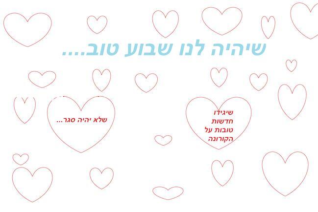 אני מאחלת לכולנו שבוע טוב ושלא שנוכל לצאת לקניון,לים,לבאולינג,לצימר,למלון קיצר הבנתם....