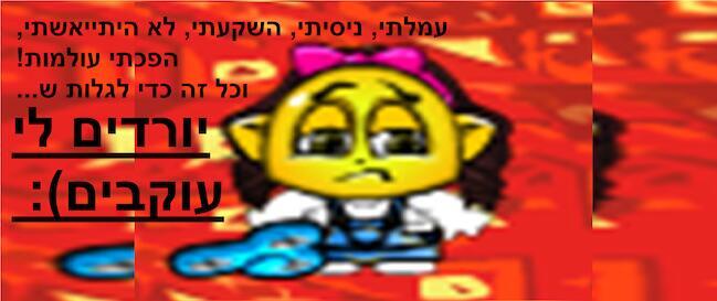 אוי! זה מבאס ברמות! אני ממש מצטערת בשבילך ואני כבר עוקבת שלך. זה מבאס שיש בעיה במחשב, תאמת שגם לי לפעמים יש, אבל אני לא יודעת עם זה מהסוג שהיה לך, כי עדיין יכולתי לעלות ולהגיב. תודה שאת משקיעה ביצירות שלך בשביל שנהנה, זאת הערכה מאוד גדולה! מקווה שלא תהיה לך יותר בעיה במחשב יותר ;) love איילת77777 |