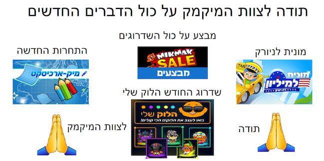 תודה לצוות המיקמק על כול הדברים החדשים והטובים -----------------------------------------------------------------------תודה לכם צוות מיקמק על השדרוגים והתחריות והמבצעים -------------------------------------------------------------------תודה על המונית לניורק ושדרוג החודש הלוק שלי ועל המבצעים מיקסייל ועל תחרות החדשה מיקארכיטק -------------------------------------------------מעריך את השקעה שלכם ארץ גושן