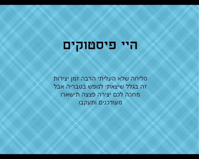 סליחה שלא העלתי הרבה זמן יצירות זה בגלל שהייתי בנופש אבל יצירה מטורפת מתקרבת תהיו מעודכנים ותעקבו