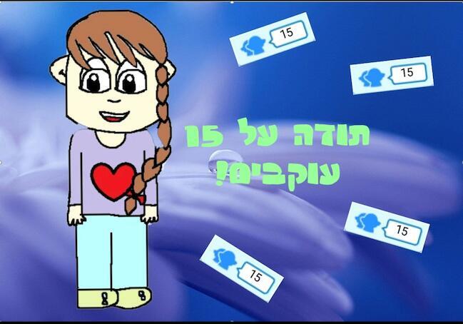 אז תודה על 15 עוקבים! אני יודעת שיש כאלו שיגידו ש15 עוקבים זה קצת כי להם יש מאה או מאתיים או אלף או לא יודעת כמה אבל בשבילי כל עוקב הוא חשוב ו15 עוקבים לפי דעתי זאת התחלה יפה לקהילה כמובן שאני רוצה עוד( מי לא רוצה?)אבל בינתיים אני חושבת ש15 עוקבים זה יפה( לא אמרתי את זה כבר מיליון פעם? )