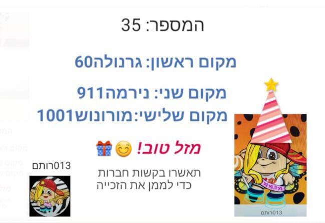 אז מה קורה מלפפונים חמוצים שלי? כאן 013רותם כרגיל מוציאה לאור את צוצאות ההגרלה! מקום ראשון שזוכה בשמלה או במעיל לבחירתה היא: גרנולה60! מזל טוב! ובמקום השני שזוכה בבדג ים או בהקדשה היא לא אחרת מאשר:נירמה911! מזל טוב! ובמקום השלישי אתם לא תאמינו אבל זוהי האחת והיחידה:מורונוש1001!מזל טוב! לכל הזוכות תצרו איתי קשר על מנת לממש את הזכייה! אוהבת מליאנתאלפים!!!!!!! 013רותםםםם