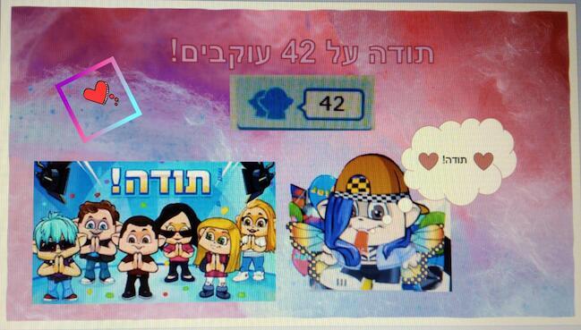 הי לכולם אז תודה תודה תודה רבה על 42 עוקבים אני מתה עליכם ברמות אני לא יודעת מתי אתמול שהסתכלתי היה לי30 ומשהו אני לא יודעת איך? מתי? אני בשוק באמת! תודה תודה תודה רבה לא דמיינתי שיהיה לי כמות כזו של עוקבים! אז אני יעשה לכם אתגר קטן! אתם צריכים להגיע ל---- 80 עוקבים! אני בטוחה שתצליחו אז זה הכל תודהההה ענקית! :) :) :) :) טוב אז תיתנו לי ליק תגובה ועוקב תודה רבההה!:) ביוש!