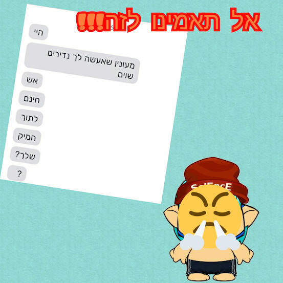 יואאאווו אתה מזה צודק זה באמת נכון ונורא מעצבן שילדים עושים את זה!!! מלאאאא פעמים ילדים שאלו אותי אם אני רוצה מיק על מיק ואני אמרתי שאני אוהבת את המיק שלי ואני לא נותנת אותו לאף אחד :) |