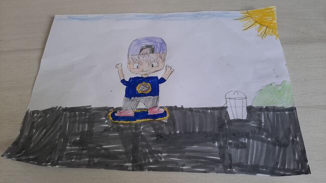 מקס רוכב על הסקייטבורד שלו באמצע הכביש