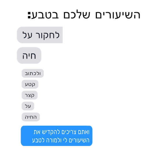 מקווה שהבנתם את המשימה והפעם אני נותנת נקודות למי שעושה את המשימה ב10 נקודות אישיות התלמיד מקבל יום חופש ואני עושה לו את שיעורי הבית למשך שבוע אחרי יום החופש אם הכיתה מקבלת 100 נקודות אני עושה להם את השיעורים במשך חודש ונותנת להם לבחור איזה שיעור הם יעשו והם ילדנו רק את השיעור הזה במשך כל היום או שהם רומים כמה שיעורים שהם בחרו והם ילמדו אותם כל היום