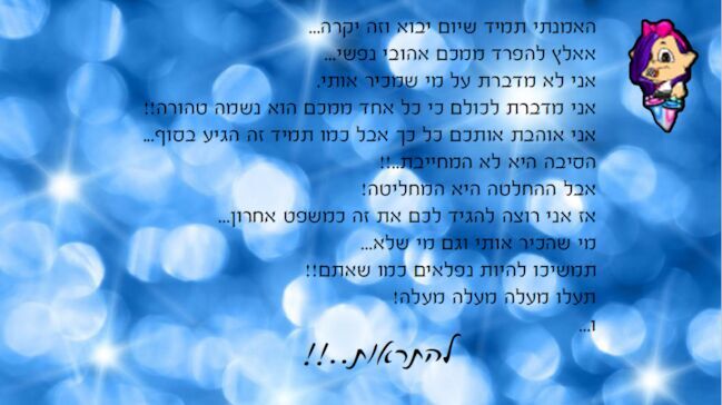 מהממת! אולי את לא רואה את מה שאני כותבת אבל את נהדרת, ומדהימה ואין דבר בלתי אפשרי בשבילך! עופי לירח ואם לא תצליחי תוכלי לנחות בין הכוכבים :) מדהימה! עצוב שעזבת |
