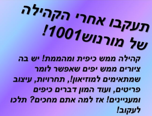 היי מיק סופגניות!! היום עשיתי המלצה בהפתעה למורנוש1001!!! יאללה לכו לראות את הקהילה המדהימה שלה!!