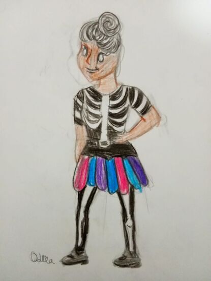 טוב אז הנה הפריטים: שיער אסוף שחור חולצת שלד חצאית טוטו צבעונית גרביון שלד עצמות ונעלי בובה כסופות