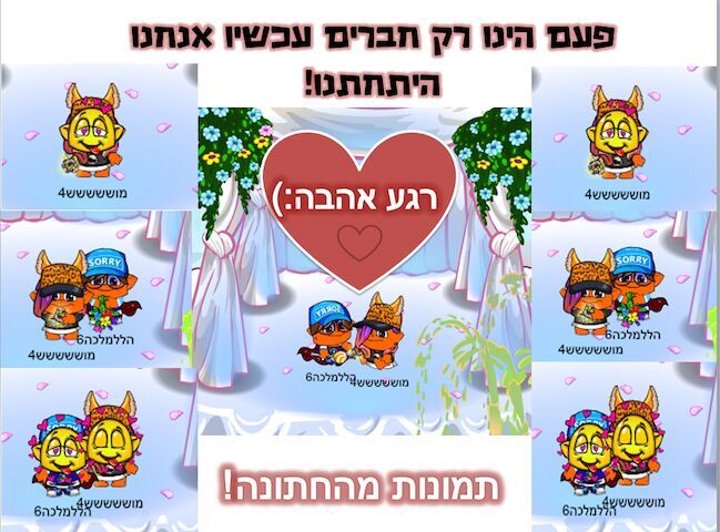 היושששקהה מה קורה מושלמים שלי?! אז היום אני עשיתי יצירה בנושא: היתחתנו!!! יאייייייייי:))))) פעם הינו ק חבריםם!! עכשיו גם היתחתנו במיקמק!! ביכביכ!!!:) טוב אז כמו תמיד אין לי זמן בדיוק אני מסימת להשקיע בכל יצירה ואומרים לי לצאת ביכ!! קיצרר! הללמלכה6 שלי כמו שהוא הוזכר ביצירות הקודמות שלי:) קיצרר בביייייייייייייייייי סליחוש כי אני חייבת ללכת בייי!! מוששששש4!