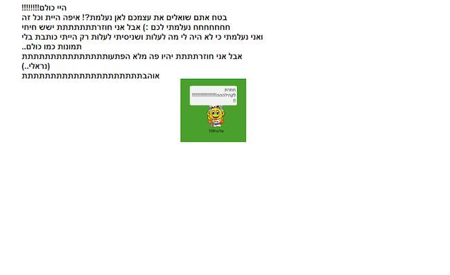 הייי כולםםםםםםםםםםםםםםם!!!!!!!!!!!!!!!!!! מה קורההההההההההה???????????????????? יואוו איך התגעגעתי אליכםםםםםםםםםם!!!!!!!!! ❤ כןןןןןןןןןןןןןן אני חוזרת!!!!!!!!!!!!!!!! קולולולוללווווווווווווווווווו וגם למי ששואל אם אני עדיין בקשר אם דניאל (מוקמוקוניה) התשובה היא לא :) טובבבבבבבבב אוהבת אתכםםםםםםםםםםםםם! ביייייייייייייייייייי!