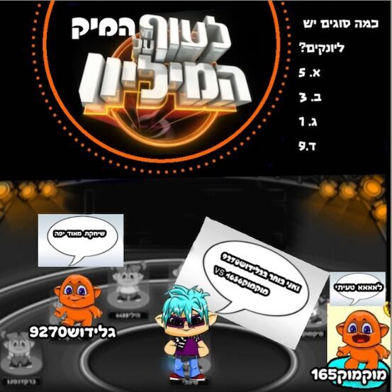 היוששששששש! אז חשבתי ועיצבתי רעיון לשידרוג החודש. כולם מכירים את התוכנית לעוף על המיליון אז למה לא לעשות כזה בגרסת מיקמק? אז חוקי המשחק: זה בעצם דומה לראש בראש, נכנסים הרבה מיקמקים ללעוף על המיק מיליון המנהל אסי בוחר 2 מהמשתתפים ועושה בניהם דו קרב על ידע כללי. ברגע שמישהו טועה אז הוא "נופל" למים ונפסל בעצם. אחר כך המנהל אסי בוחר עוד מישהו לדו קרב נגד מיקמק שחיכה. ככה עושים עד שמישהו מצליח ומנצח! ואז אתה מקבל פרס כגון: מטבעות מיקמק, פריטים שעיצבתי ( תכף אעלה), מיקביט,פריטים,ועוד ובנוסף לפריטים שתכף אעלה: אני חושבת איך לעצב בית ללעוף על המיק מיליון!! תגיבו לי אם אהבתם:) ותרצו שאעשה עוד? * אין להעתיק יצירות!! כל הזכויות שמורות לממתקוני268 * אני ממש משקיעה בקהילה שלי אשמח אם תמליצו לאחרים ❤❤❤❤❤❤❤❤❤❤❤❤