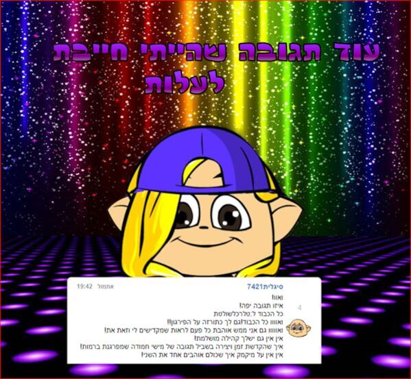 ואווווו תודה רבה רבה רבה! איך שאני אוהבת אותך! ואוווו דייי אין עלייך! אין על כתורזה אין! ישלך תמונת היום? מיקמק אתם חייבם לעשות את כל הקטע הזה שכתורזה עושה על התגובות! כל הכבוד! יאוו אני מתה עלייך! מעריצה שלך! הקהילה שלך מהמממת! יותר יפה משלי! |