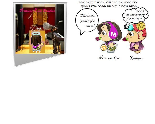 היייייי קימיייייים שלי! אני כבר יותר משעה עובדת על זה! מקווה שתאהבו! מקווה לתמונת יום כי לא הייתי תמונת יום :) אז מה שבעצם קורה שם זה שהנסיכהקים (אני) והחברה הכי טובה שלה לואינה (גם אני ^^ חוחו) עוברות ליד מראה, פתאום לואינה רואה במראה את הנסיכהקים באולפני הקלטות שקוראים להם: Princess Kim Studios, בעבריתף אולפני הנסיכהקים. היא רואה את קים שרה שם, וחושבת: "COOL! כנראה שאני לא יודעת הכל עליה." והנסיכהקים אומרת: "This is the power of a miror!" זה הכוח של המראה! כלומר, מספיקה מראה אחת כדי להבין שאתם לא יודעים הכל על החבר שלכם! מראה לא אמיתית, הכוונה היא שהמראה היא מטפורית/ היא דימוי- מטפורה, ושתוך שאלה אחת ששואלים אותו ואיך שהוא עונה... להבין שהוא לא בדיוק מי שאתם חושבים שהוא. אני מאוד מקווה שנהניתם ושזה יעלה היום. היום יום שישי ה-20.11.20 אז שבת שלום!