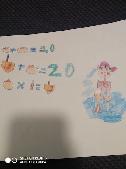הסבר:סופגניה ועוד סופגניה שווה עשר.סביבון ועוד סופגניה שווה עשרים.סופגניה כפול נר שווה סביבון.
