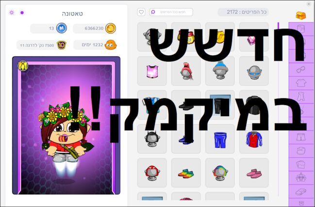 שלום לכולם!! אתם בתך תוהים למה ממזמן לא העלתי יצירה והיום אני אסביר בקיצור אני מחכה ללוח גרפי לצייר איתו ואז אני בלי נדר העלה הרבה יצירות.... אני לא יכולה לחכות כבר!! טוב כפי שאתם רואים היום נכנסתי למיקמק ובוםםםם מה אני רואה הכל חדשששש איזה יפה אתם תוכלו גם לשים את הפריטים שאתם אוהבים בניפרד וגם את אלו שכבר לטעמכם כבר ישנים ולא מספיק תישתמשו תוכלו אותם לשים בתיבת האיכסון טוב אז יאלה כנסו למיקמק ותראו מה מצפה לכם!! בהצלחהההה אוהבתתתת המוןןןן טאטונה.