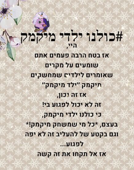 היי, אני בטוחה שהרבה פעמים נתקלתם ביצירות של מיקמקים שאמרו שקראו להם ילדי מיקמק, אבל אותי, אותי, זה ממש לא מעליב! כי כולנו ילדי מיקמק, בעצם, כל מי שמשחק מיקמק! אנחנו ילדי מיקמק בלב ובדםXD גם מי שאמר לכם הוא ילד מיקמק, כן, הוא גם משחק מיקמק! וזו יצירה שמוקדשת לכם ולנטע(בלגי319) כן, בלגי עשתה את היצירה הזאת ואני גם עודה את זה עכשיו:)) אז אם קוראים לך ׳׳ילד/ת מיקמק׳׳ אז זה לא אמור להעליב! את/ה אמור להתגאות בזה אפילו! וגם אם מישהו מתכוון להגיד את זה בקטע של העלבה, זה לדעתי לא יפה... אז אל תקחו את זה קשה, תתגאו בזה! שאתם משחקים באתר המדהים הזה!! מקווה שהבנתם שכולנו ילדי מיקמק ו... #כולנו ילדי מיקמק