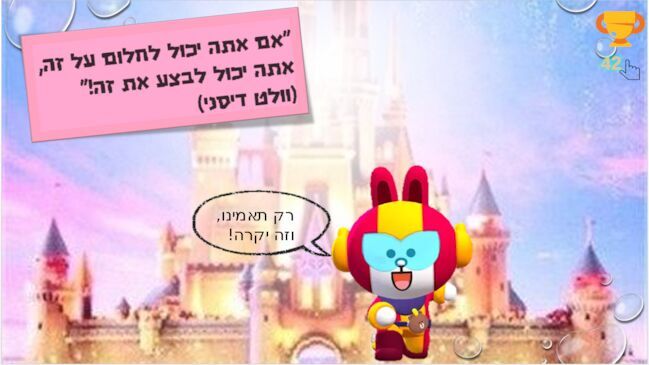 היי חברים (: מה שלומכם? חזרתם ללמוד? אני כן, ואני ממש ממש שמחה מזה! בואו נתחיל! שניים מהנושאים הכי חשובים הם אמונה עצמית, ולחלום (: שילבתי אותם, עם משפט של וולט דיסני ורקע דיסנילנד, וזה מה שיצא! אני חושבת שאלה נושאים חשובים, בכל זאת, צריך לדעת להאמין בעצמך, ומצד שני.... מי לא אוהב לחלום חלומות? אז המשפט של וולט דיסני הוא כזה, "if you can dream it, you can do it!" ואני תרגמתי אותו לעברית, "אם אתה יכול לחלום, אתה יכול לעשות את זה!" כלומר, אם אתם חולמים, צריך להאמין בעצמך שזה אכן מה שיקרה, ורק ככה אפשר להגשים חלומות (: אז בבקשה בבקשה! שזה יעלה! ביי