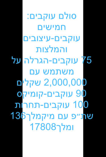 אתם יכולים לראות את הסולם עוקבים והיעד הראשון שלנו הוא חמישים עוקבים בשבעים וחמש עוקבים תהיה הגרלה על משתמש עם שני מיליון שקלים!!! חוקי ההגרלה יהיו אחרי שאני אגיע לחמישים עוקבים וגם תהיה תחרות שת״פ עם מיקמלך136 ומלך17808 אבל זה יהיה כשלושתנו נגיע למאה עוקבים אז אל תשכחו לעקוב כי התוצאות יהיו טובות כשתעקבו