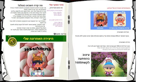 היי! ממש התבאסתי שביטלו את המיקמקון (למרות שזה היה לפני הרבה זמן). הייתי כל יום מסתכלת לבדוק אם יש עיתון חדש והייתי עוקבת אחרי זה... אחרי שסגרו את המיקמקון המון משתמשים החלו ליצור עיתונים משלהם, ועכשיו ניסיתי גם אני (למרות שזה נכחד כבר)... תודה רבה לי, שערכה את העיתון. מקווה שתצחקו מהבדיחה:) למי שלא שם לב, הקורא הראשון שיגיב את התשובה הנכונה לחידה שלי זוכה בפרס (מתואר בעיתון)!! ומזל טוב לקשת1600, היא נבחרה לעיצוב בהפתעה:) ותודה רבה רבה על כל אלה שענו על הסקר. התפלאתי מאוד שכולם (למעט לילה1399) סירבו לבקשה שלי ולא הסכימו להתראיין. אני מכבדת את הבחירות שלכם לא להשתתף, אבל אנא מכם, סרבו בנימוס, ולא כמו שדחיתם את ההצעה שלי... אני מחכה כבר לקרוא את התגובות שלכם ולשמוע איזה עולם בחרתם? אני בחרתי בעולם השוקולד:) וכמובן שמקווה שאהבתם את המדור "היצירה האחרונה שלי". אני יותר מאשמח אם תקליקו על המיקמקון ותתנו לייק ותגובה אם אהבתם, ותעקבו על מנת לעקוב אחרי שאר המיקמקונים שלי שילכו וישתפרו:) חמישה לייקים למיקמקון הבא! ביייי:) נ.ב- תבקשו הקדשות ועיצובים:)