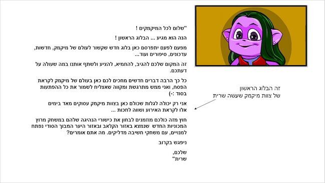 טוב אז כפי שאתם רואים בתמונה הזאת כתוב "שלום לכל המיקמקים ! הנה זה מגיע ... הבלוג הראשון ! "