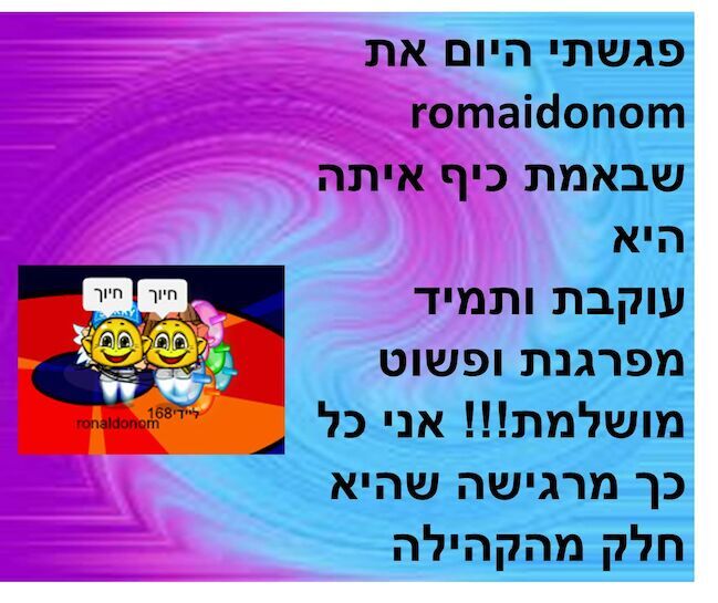 אז היום פגשתי את romaidonom שהיא גם עוקבת בקהילה שלי ופשוט מפרגנת ומושלמת כך לגבי כולם אבל היום פגשתי אותה!! ואתם גם יכולים לראות מהיצירות הקודמות שלי ומי שעוקב ורוצה גם תמונה תשלחו חברות אז יאלה ביושש אוהבת את כולם ואל תשכחו לעקוב :)