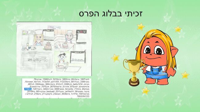 היי חברים!! מה קורה? אני ממש שמחה:) זכיתי בבלוג הפרס!!! עשיתי שיעור קונדטוריה! וכל ההשקעה הייתה שווה את זה! זאת הפעם הראשונה שלי בבלוג הפרס ועל הפעם הראשונה שלי זכיתי! תודה לכל מי שכתב לי תגובה ושימח אותי! בגלל שזכיתי צוות מיקמק נתנו לי מנוי לשבוע נעלי בית ובית מושלג תודה צוות מיקמק! מקווה לזכות גם במיקשימה החודשית!