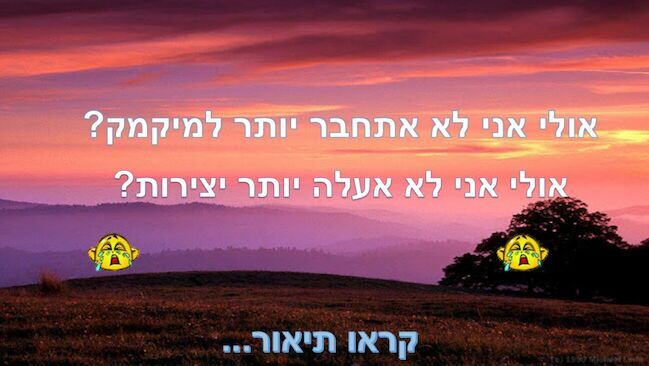 בגלל שעדיין לא התקנתי מיקמק למחשב אז כנראה אני ונטע נסגור את השת"פינה שלנו כי אנחנו צריכות להכנס למיקמק לצלם את מי שאנחנו רוצות לעשות לו עיצוב או לוגו ואנחנו לא יכולות להכנס למיקמק כי אין לנו מיקמק למחשב ואי אפשר להכנס מהדפדפן ובקיצור הבנתם :( בגלל שאני לא יכולה להתחבר למיקמק לא צילמתי את המיקמק שלי בוכה /: