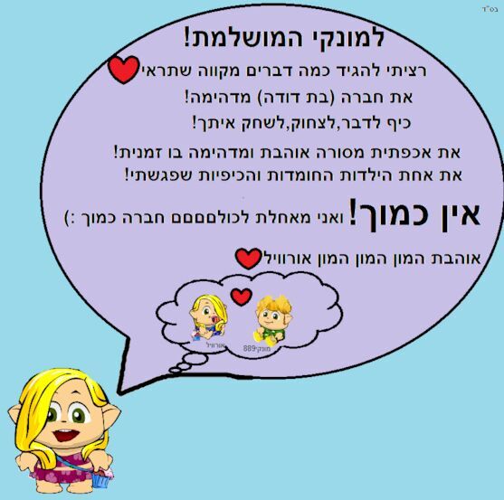 היי מה קורה?! אז היום העלתי יצירה לבלוג הפרס! ברכה למונקי889 המושלמת החובה שלי עליה היא: "תעצבי בגד בשבילי :)" וגם רצתי להוסיף שראיתי שגם מונקי שלחה לי ברכה וראיתי שהיא שכחה להוסיף אתגר אז התקשרתי אליה וזה האתגר שלה עלי: "תעשי יצירה לקהילה שלך 10 עובדות עליך" נ.ב הגענו ל90 עוקבים!!!!!!!! זה מטורף אתם מושלמיםםםם שנגיע ל100 עוקבים יהיה ספיישל מטורףףף וזה הכל להיום מקווה שנהנתם אוהבת מלא אורוויל