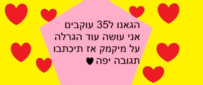 הי ארנבות שלי אין לי כרגה כל כך זמן לעלות יצירה אני יעלה בקרוב אני רק רוצה לאגיד שיש לנו זוכה efrat12343 היא הזוכה אם אתם רוצים גם ליזכות אז נגיעה ל45 עוקבים אני יודעת שאתם מסוגלים כבר אוכחתם את זה בעגרלות הקודמות ❤ גם אני רוצה כבר לעלות אבל אני לא יכולה כרגע ביגלל עומס בלימודים אז שאני יוכל אני יעלה יצירה יעלה ביייי |