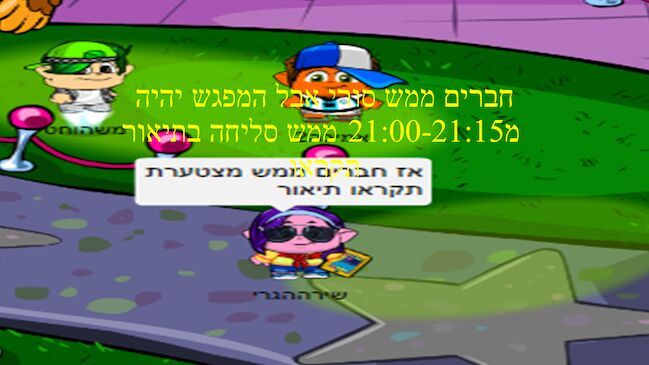 חברים אני מצטערת מאודדדדדדדדדדדד ממש מצטערת אבל המפגש כתוב שהוא יהיה ב שרת: קוקוס יום: שני שעה כתוב שבע אבל אני לא יכולה אז עדכון פרטים חדש בשביל המפגשי