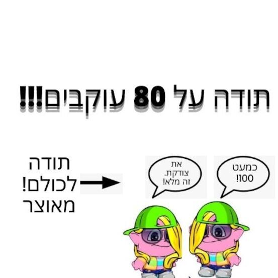 היי אוצרים שלי! מה קורה? מה נישמע? הכול סבבה חחח (אני אחראית גם על הקהילה של AHRUA81 אז זה אותו פתיח... אני המצאתי אותו ) אז אין לי 80 עוקבים יש לי 79 אבל עוד עוקב 1 80 עוקבים! וזה מלא! כמו שאוצר אמרה ביצירה אז עם עוד מיקמק 1 יעקוב יהיה 80 עוקבים אני מאוד מקווה שנגיע ל100 עוד 21 עוקבים אנחנו ב100 עוקבים!! אז מאוד מאוד מקווה שתיכתבו ל תגובות שהעוקבים לא ירדו ושיהיה רק כיף! אז, תודה לכולכם גם למי שלא עקב אוהבת המון!