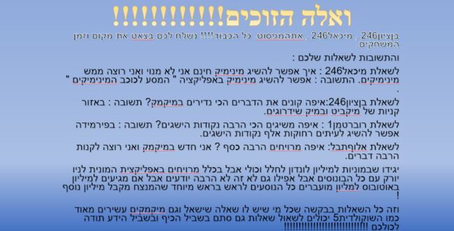 אם יש למישהו שאלה שיכתוב כאן בתגובות ויכתוב כרטיס הגרלה ואת הקוד הנוכחי .הקוד הנוכחי :"מגרשים את הקורונה". אם אתם רוצים חמש מיליון ואם לא אתם יכולים לשאול שאלה.
