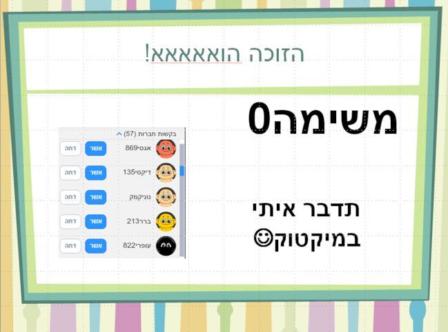 היי חברים! מה נשמע? אני מתרגשתת טוב:) הזוכה שלנווווו הואאאאא משימה0 טוב ------------------------------------------------------- עוד משהו הערוצים הכי טובים(לפי דעתי) זה הערוץ של משימה (משימה מהמיק) והערוץ של ורודייי12 הם ערוצים מושלמים! אני אוהבת אותם מרשמלו1ח